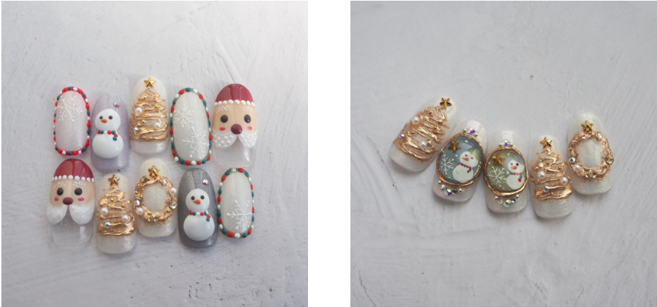 - Farbstrategie: Traditionelle Rot-, Dunkelgrün-, Gold- und Silbertöne dominieren weiterhin, werden aber durch hochglänzende Metallic- und Perlmuttrosa-Nuancen akzentuiert, um eine glamouröse Festtagsstimmung zu erzeugen und gleichzeitig alltagstauglich zu bleiben. – Textur und 3D-Effekt: Die subtile Kombination aus feinen Metallic-Linien, winzigen 3D-Verzierungen (wie Perlen und Mikroperlen-Applikationen) und dem French-Manicure-Rand verstärkt die Wirkung der einzelnen Lagen, ohne überladen zu wirken.